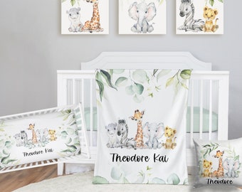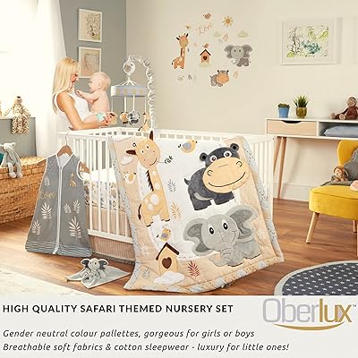 Safari Themed Nursery Bedding: The bedding comes with one comforter, two fitted crib sheets, a crib skirt, a wearable blanket and wall stickers, and is made in a gender neutral palette of gray, beige, and white.